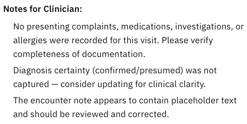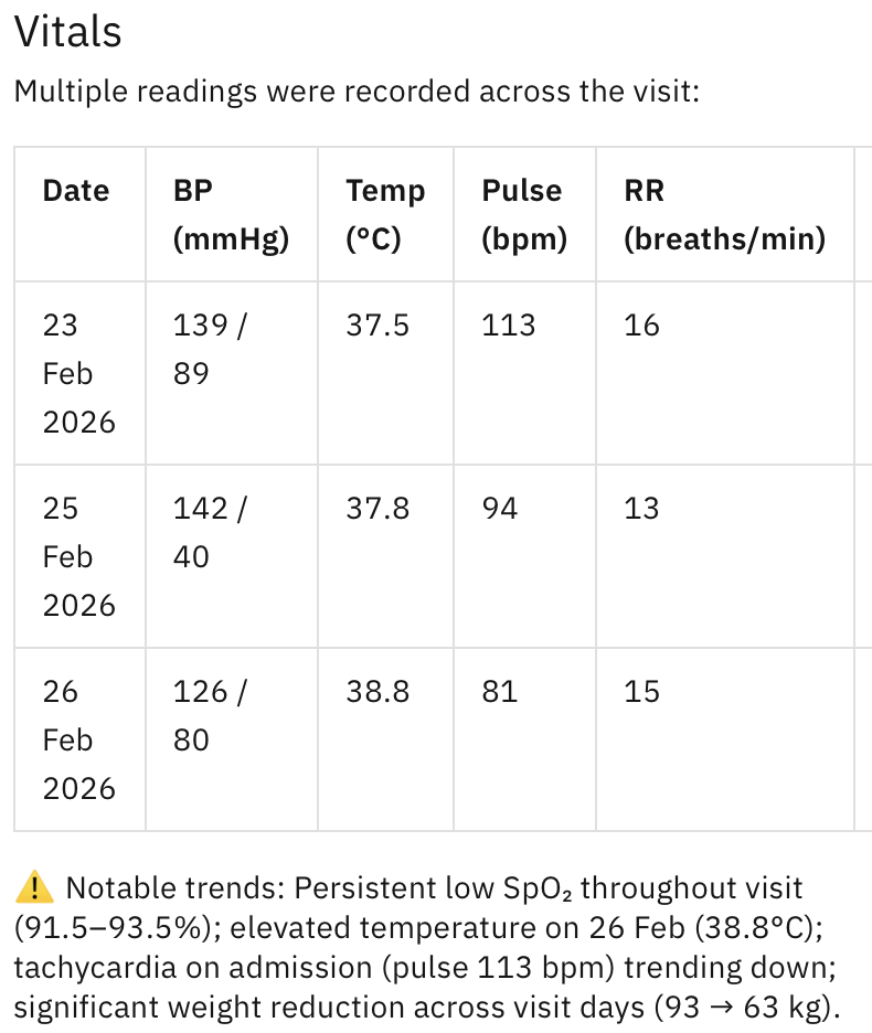 What I found cool was that, if you test this out on the demo data of the patients, it can flag out things to look out for, even when it wasn’t explicitly prompted to do so. Here are some examples: