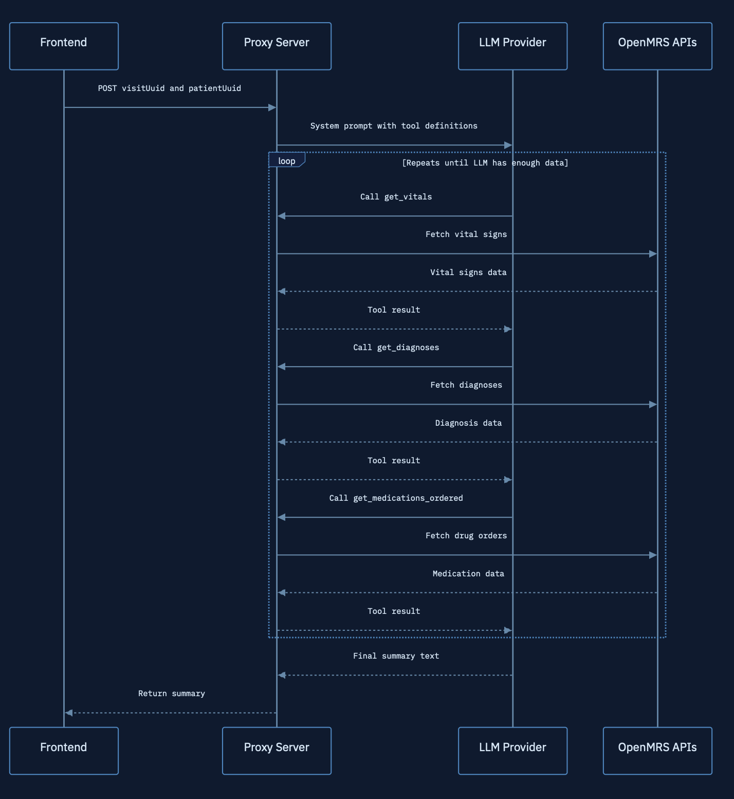 The proxy server is a ExpressJS server, which, based on the endpoint, has a system prompt which hands the LLM a set of clinical tools and tells it to fetch the data it needs from OpenMRS — vitals, diagnoses, medications, allergies, presenting complaints, and more.