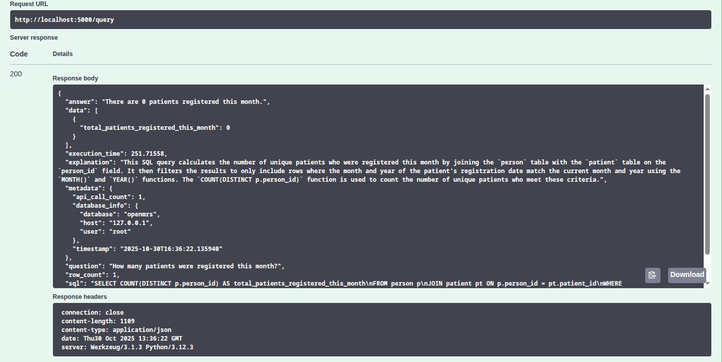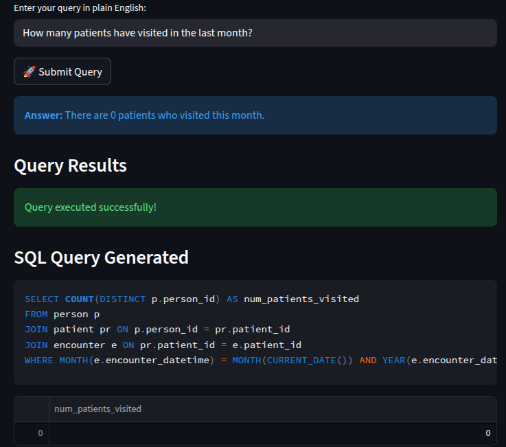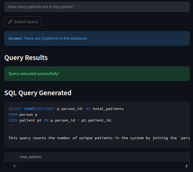 We also provided the data model to the LLM in YML format, detailing the tables, columns and relationships which we demand the model to use in the prompt(s). We also made certain that the system automatically standardizes queries. For instance; the Person table is used for demographic data, patient table for clinical data. While it may seem like it is obvious to know that person_id = patient_id and that these two tables have no direct relationship (foreign keys), it was NOT! so we had to clearly state that and how we would join them when required. So we have functions to flag the generated queries correct or incorrect based on the facts as described in the data model, with other functions making minor adjustments for better results.