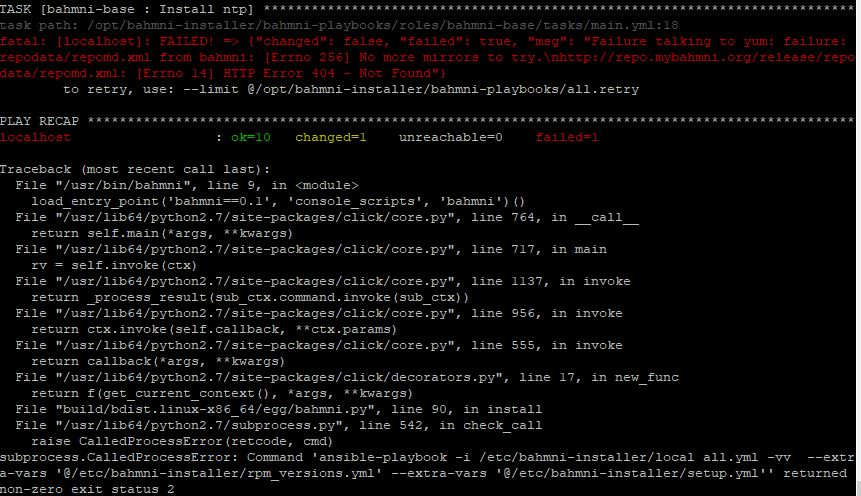 Traceback (most recent call last): File “/usr/bin/bahmni”, line 9, in load_entry_point(‘bahmni==0.1’, ‘console_scripts’, ‘bahmni’)() File “/usr/lib64/python2.7/site-packages/click/core.py”, line 764, in call return self.main(*args, **kwargs) File “/usr/lib64/python2.7/site-packages/click/core.py”, line 717, in main rv = self.invoke(ctx) File “/usr/lib64/python2.7/site-packages/click/core.py”, line 1137, in invoke return _process_result(sub_ctx.command.invoke(sub_ctx)) File “/usr/lib64/python2.7/site-packages/click/core.py”, line 956, in invoke return ctx.invoke(self.callback, **ctx.params) File “/usr/lib64/python2.7/site-packages/click/core.py”, line 555, in invoke return callback(*args, **kwargs) File “/usr/lib64/python2.7/site-packages/click/decorators.py”, line 17, in new_func return f(get_current_context(), *args, **kwargs) File “build/bdist.linux-x86_64/egg/bahmni.py”, line 90, in install File “/usr/lib64/python2.7/subprocess.py”, line 542, in check_call raise CalledProcessError(retcode, cmd) subprocess.CalledProcessError: Command ‘ansible-playbook -i /etc/bahmni-installer/local all.yml -vv --extra-vars ‘@/etc/bahmni-installer/rpm_versions.yml’ --extra-vars ‘@/etc/bahmni-installer/setup.yml’’ returned non-zero exit status 2