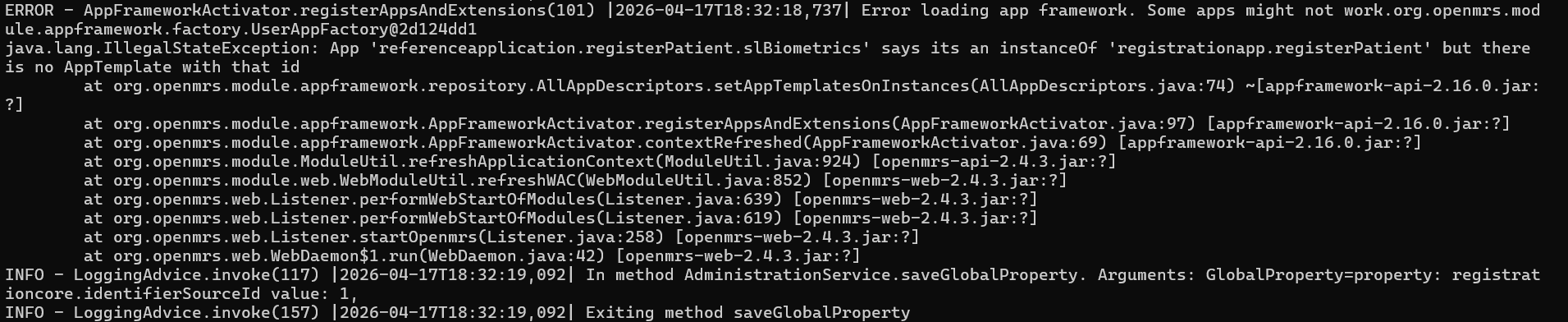 This brings me to the integration with the registration app. In System Administration → Manage Apps → Add App Definition, I added json that included the fingerprint widget, as well as the default patient form fields (name, address, phone number etc).