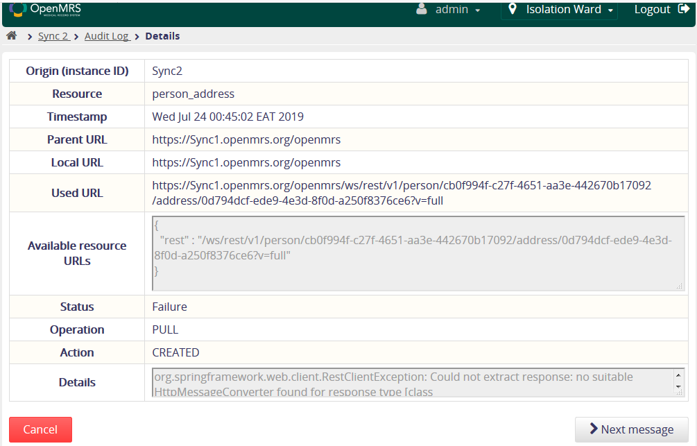 @dkayiwa I registered patients then clicked on sync2, Configure the âLoad Configurationâ functionality successfully. Performed âManual Push to the Parentâ which was successful, but when I click on Audit log, the status is failure. And this is the screen after clicking on Audit Log