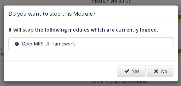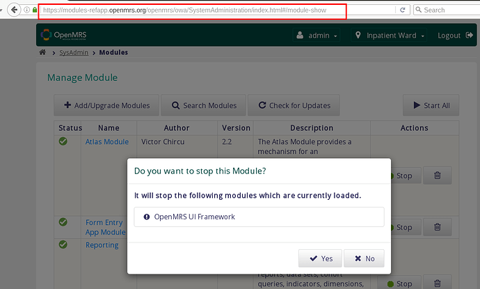 I still see a problem. For instance if i try stop the Atlas Module, am told that it will stop the OpenMRS UI Framework module. Does this mean that the OpenMRS UI Framework module depends on the Atlas Module? My understanding is that it is the other way around. In other words, it is the Atlas Module that depends on the UI Framework module. And hence attempting to stop Atlas should not have anything to do with the UI Framework module.