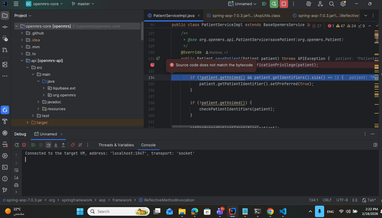 That message happens when the code you are running is a different version from the code you have in your IDE. Make sure you have the tag corresponding to whatever version of OpenMRS Core you’re debugging against.