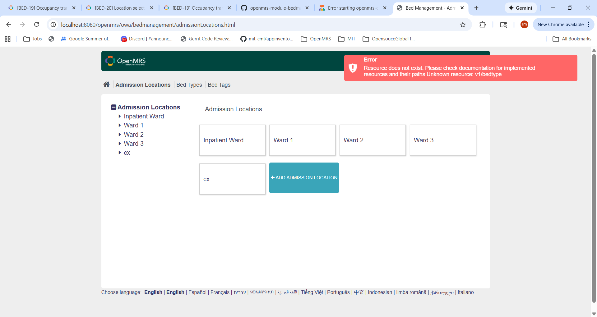 Good Evening, I am working on the issue BED-19 . I have setup my openmrs sdk server, and I have open web apps running. When i click on Admission Locations, or inpatient Ward or Ward 1 i get the below error. If i try to add bed type or any details and save i get the same error. Also I cannot see bedmanagement.omd in my local folder.