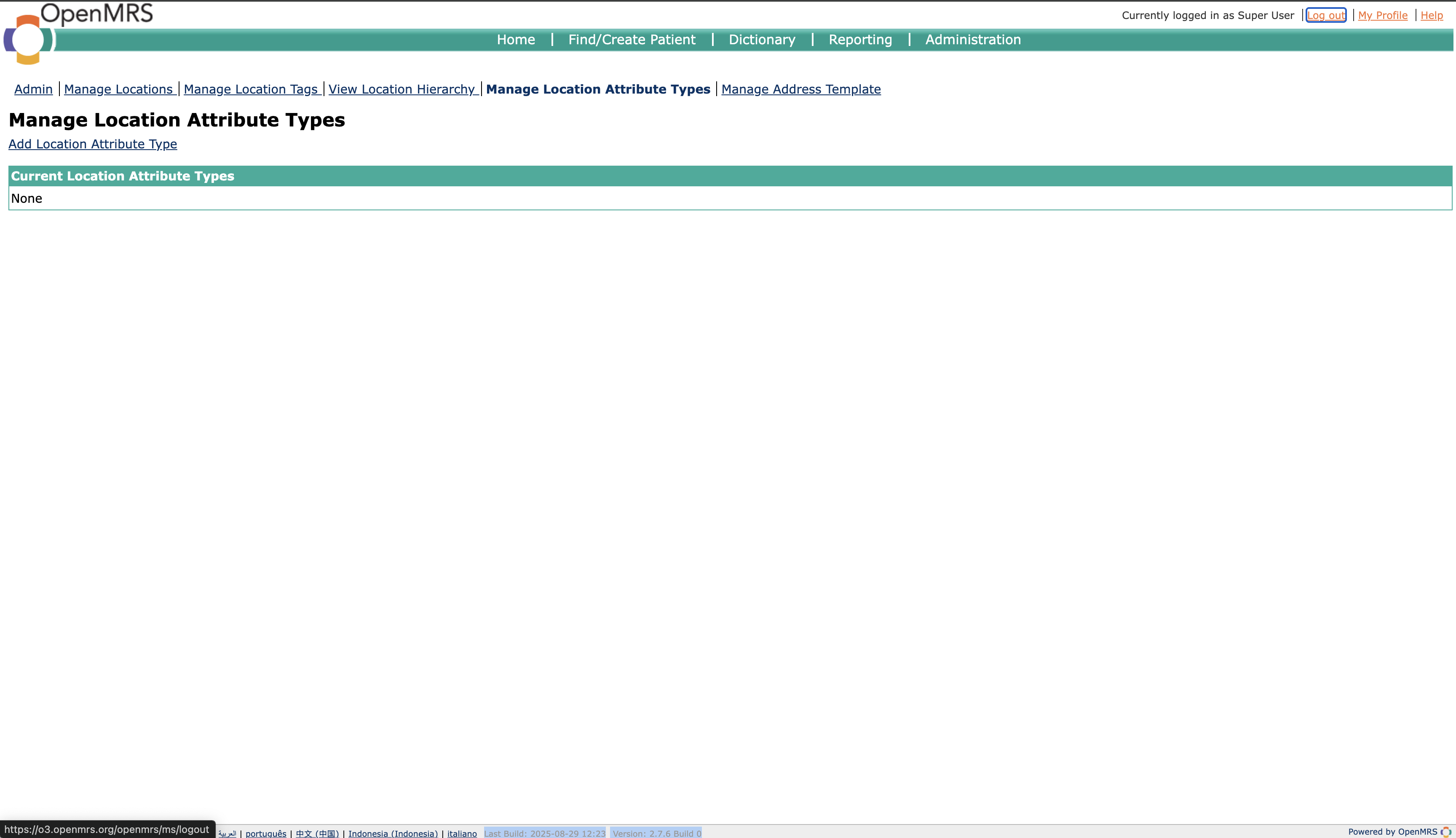 When accessing the locationAttributeTypes.list page via the Legacy UI module, the page returns a “None” response in the body, even though Location Attribute Types exist in the system. The issue appears not to be related to saving or persistence, as new attribute types can be successfully added. However, the list view fails to render any of the available entries.