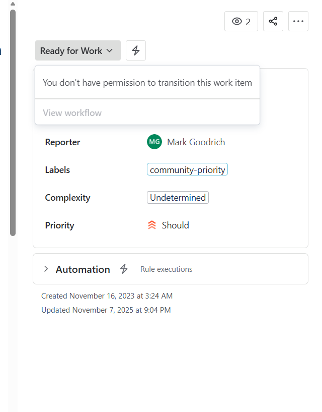 When I click the status, I get this exact message: ‘You don’t have permission to transition this work item.’