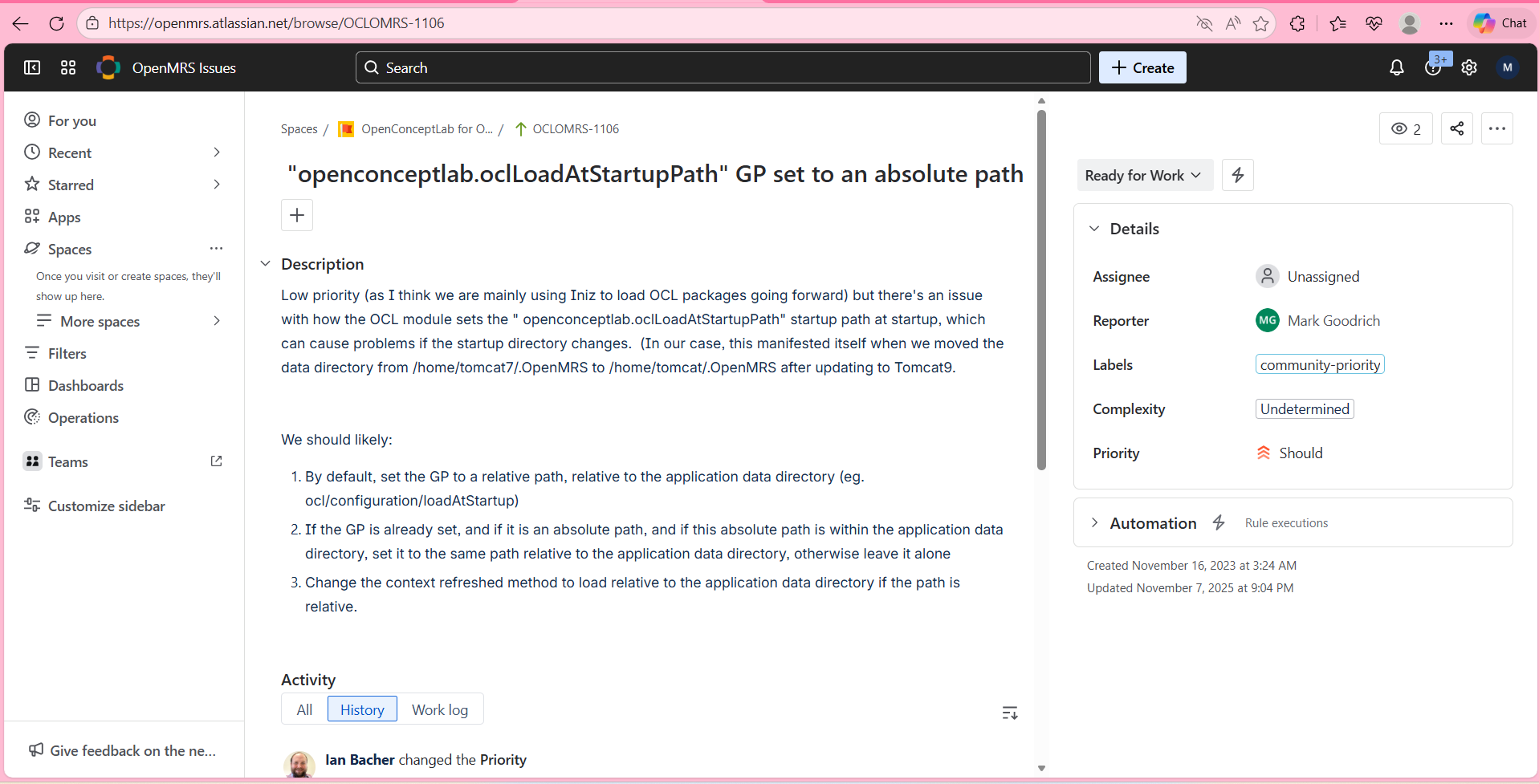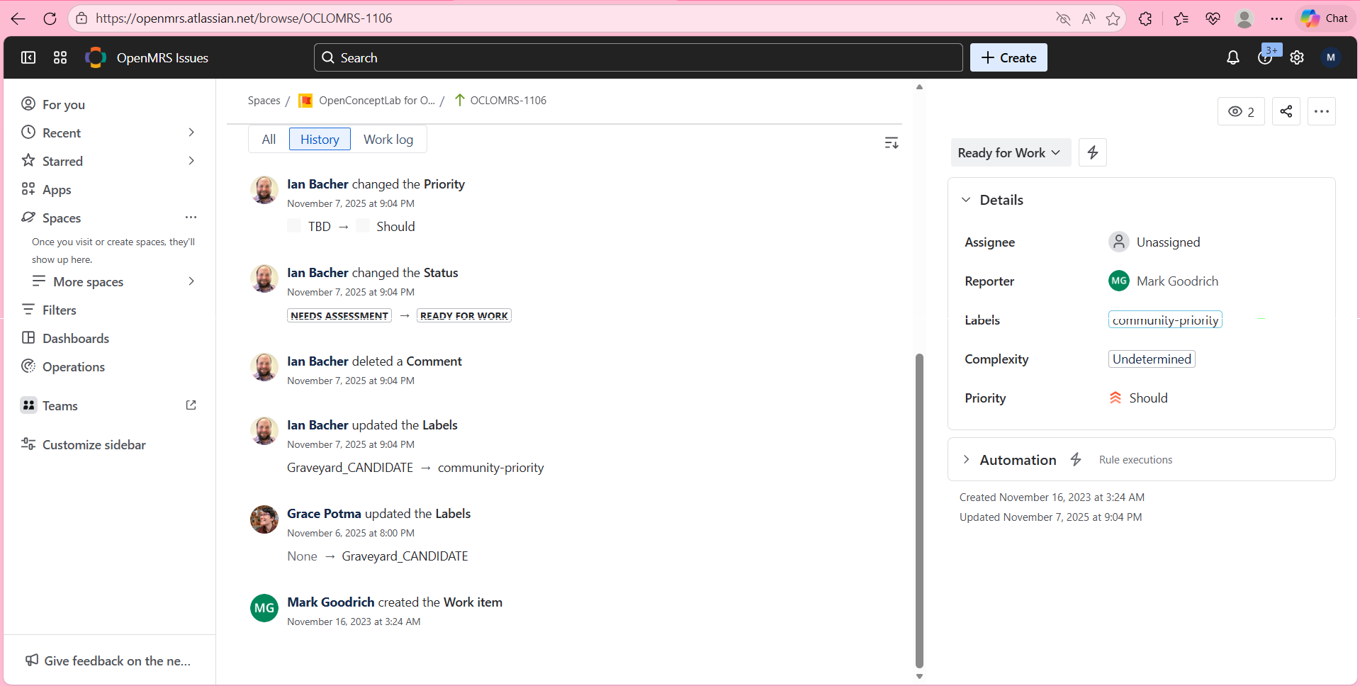 Hi @dkayiwa sir, thanks for the quick reply! Here is what I see on the JIRA page. As you can see, I do not have an ‘Assign’ button or a ‘Claim’ option in the toolbar. The status is ‘Ready for Work’, but I cannot click it to change it .