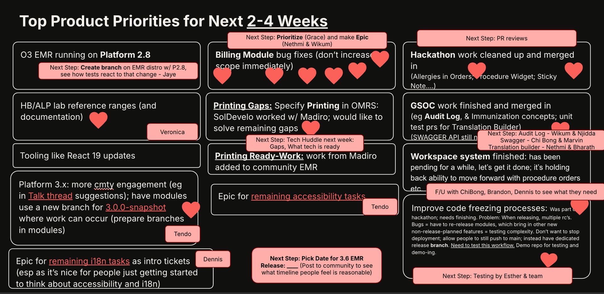 Next Step: Tech Huddle next week: Gaps, What tech is ready - @pwargulak@jnsereko did this end up happening? Or would you like me to book a focus session? We can also use this week’s O3 squad call too.