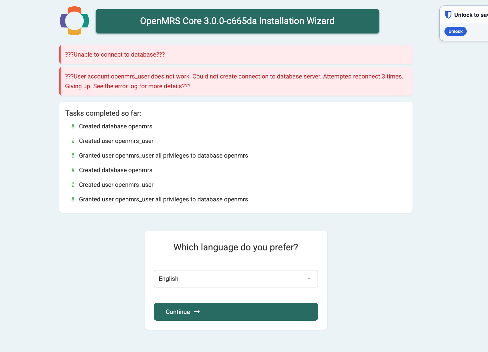 - Sees like it failed when it tried to create the tables using the openmrs_user that it created in the last step.